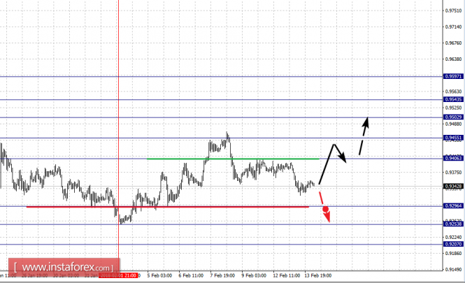Продолжения движения кверху ожидаем после пробоя 0.9406, в данном случае первая цель 0.9455, пробой которого позволит рассчитывать на движение к 0.9502, в коридоре 0.9502 – 0.9543 консолидация. Потенциальным значением для верха, считаем уровень 0.9597, по достижении которого ожидаем откат книзу.