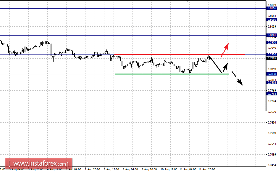 Уход в коррекцию возможен после пробоя 0.7920, здесь цель – 0.7970, диапазон 0.7970 – 0.8001 является ключевой поддержкой для нисходящей структуры, его проход ценой будет располагать к развитию восходящей структуры, в данном случае цель – 0.8066.