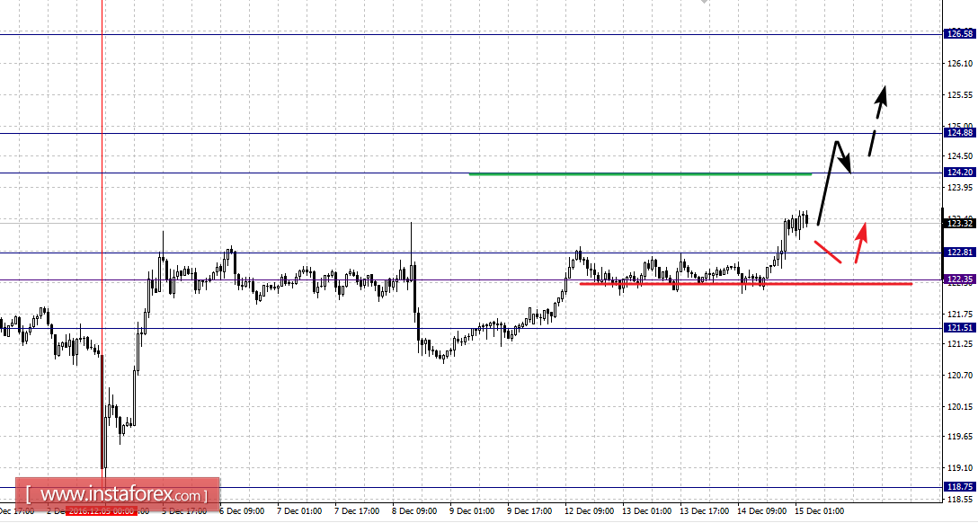 Краткосрочное нисходящее движение возможно в коридоре 122.81 – 122.35, пробой последнего значения приведет к развитию углубленной коррекции, здесь цель – 121.51, этот уровень является ключевой поддержкой для верха.