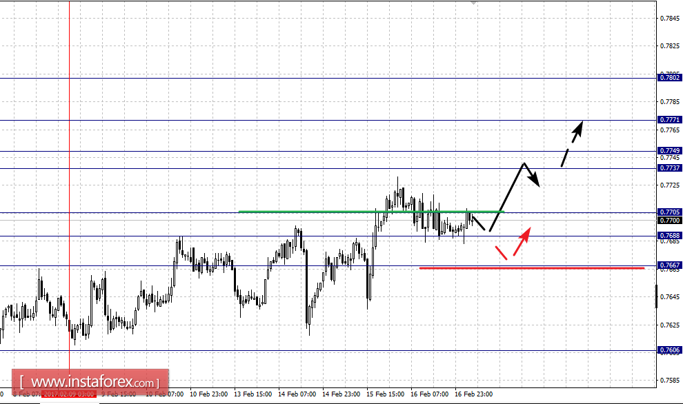 Краткосрочное нисходящее движение возможно в коридоре 0.7705 – 0.7688, пробой последнего значения приведет к углубленной коррекции, здесь цель – 0.7667, этот уровень является ключевой поддержкой для восходящей структуры.