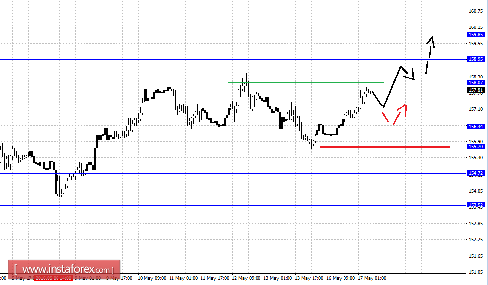 Краткосрочное нисходящее движение возможно в коридоре 156.44 – 155.70, пробой последнего значения приведет к углубленной коррекции, здесь потенциальная цель – 154.72, этот уровень является ключевой поддержкой для верха.