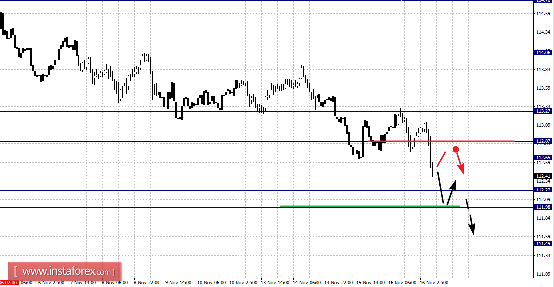По паре Евро/Доллар продолжаем следить за восходящей структурой от 7 ноября. По паре Фунт/Доллар в качестве основной тенденции рассматриваем восходящую от 3 ноября. По паре Доллар/Франк продолжение движения книзу ожидаем после пробоя 0.9877. По паре Доллар/Иена на текущий момент ожидаем достижения уровня 112.22. По паре Евро/Иена восходящую структуру от 8 ноября рассматриваем в качестве среднесрочной структуры. По паре Фунт/Иена ситуация вошла в равновесное состояние в связи с затяжным развитием коррекции от нисходящей структуры 1 ноября.
