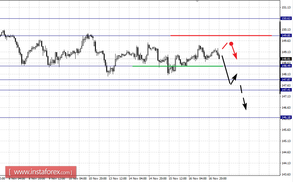 По паре Фунт/Иена ключевыми уровнями в масштабе Н1 являются: 150.63, 149.85, 148.49, 147.87, 147.41 и 146.18. Здесь мы пока продолжаем следить за формированием нисходящей структуры от 1 ноября, на текущий момент цена находится в коррекции. Продолжения движения книзу ожидаем после пробоя 148.49, в данном случае цель – 147.87, в коридоре 147.87 – 147.41 консолидация цены. Пробой уровня 147.40 должен сопровождаться выраженным нисходящим движением, здесь цель – 146.18, от этого уровня ожидаем откат кверху.