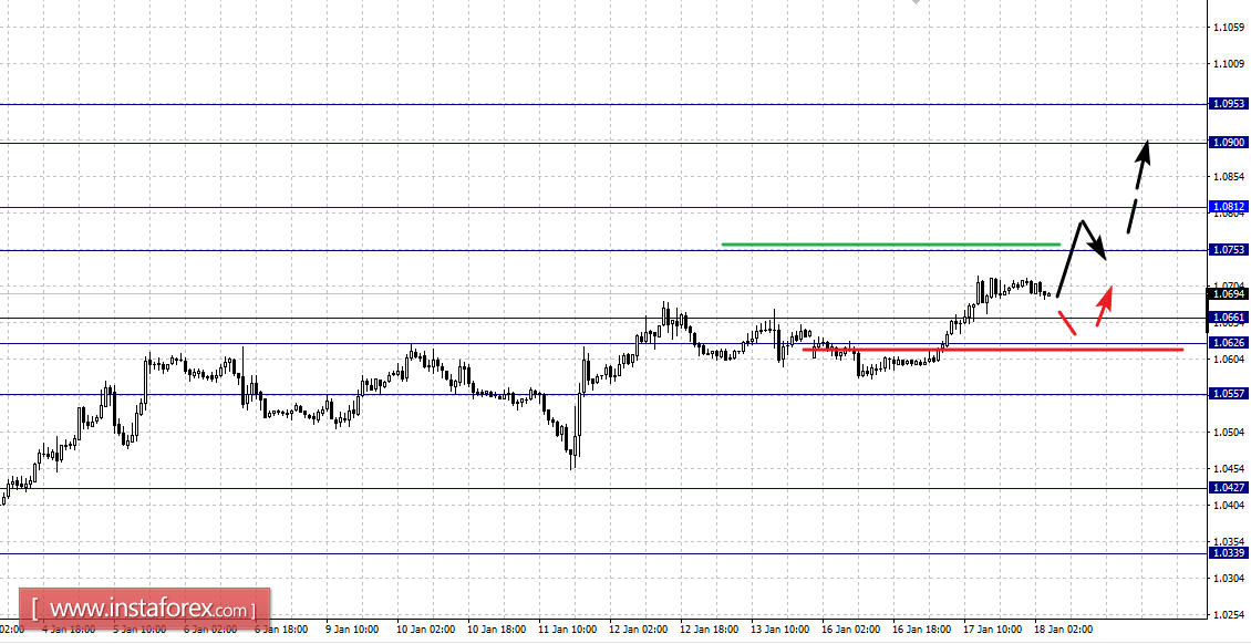 По паре Евро/Доллар продолжения развития восходящей тенденции в масштабе Н1 ожидаем после пробоя 1.0755. По паре Фунт/Доллар следим за формированием восходящей структуры от 13 января. По паре Доллар/Франк продолжения движения книзу ожидаем после пробоя 0.9974. По паре Доллар/Иена последующее движение книзу ожидаем после пробоя 112.50. По паре Евро/Иена продолжения развития нисходящей структуры от 9 января ожидаем после пробоя 120.25. По паре Фунт/Иена цена формирует потенциал для верха от 16 января.