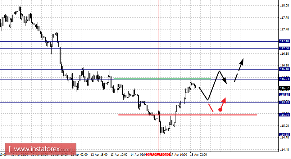Краткосрочное нисходящее движение возможно в коридоре 115.85 – 115.65, пробой последнего значения приведет к углубленному движению, здесь цель – 115.34, этот уровень является ключевой поддержкой для верха.
