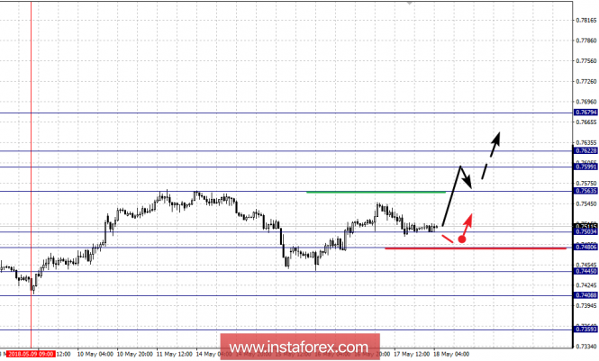 Краткосрочное нисходящее движение возможно в коридоре 0.7503 – 0.7480, пробой последнего значения будет располагать к развитию нисходящей тенденции, здесь цель – 0.7445, в коридоре 0.7445 – 0.7408, также ожидаем краткосрочное движение к низу. Потенциальным значением для нисходящего движения считаем уровень 0.7359, от которого ожидаем откат кверху.