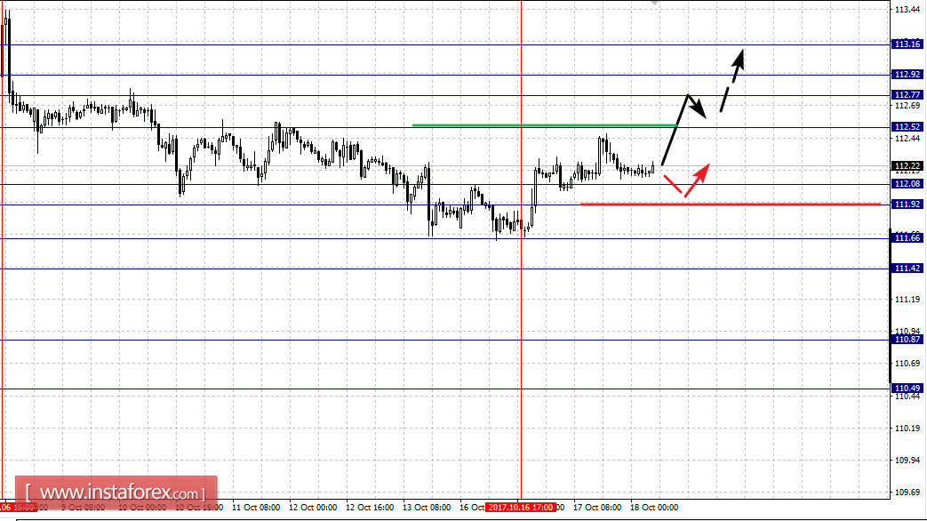 Краткосрочное нисходящее движение возможно в коридоре 112.08 – 111.92, пробой последнего значения приведет к развитию нисходящей структуры, здесь цель – 111.66, в коридоре 111.66 – 111.42 краткосрочное нисходящее движение. Пробой уровня 111.42 продолжит развитие нисходящего цикла в масштабе Н1.