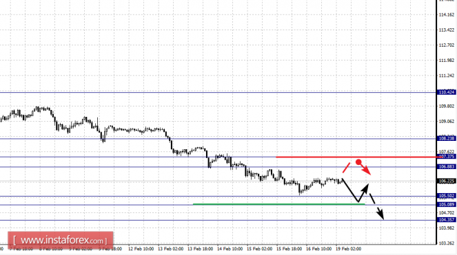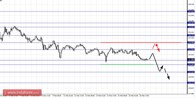 По паре Евро/Доллар цена находится в коррекции от восходящей структуры и формирует потенциал для низа от 16 февраля. По паре Фунт/Доллар цена формирует восходящую структуру от 9 февраля, продолжения движения кверху ожидаем после пробоя 1.4120. По паре Доллар/Франк цена находится в коррекции и формирует потенциал для верха от 16 февраля. По паре Доллар/Иена продолжение движения книзу возможно после пробоя 105.08. По паре Евро/Иена продолжения движения книзу ожидаем после прохода ценой шумового диапазона 131.82 – 131.36. По паре Фунт/Иена продолжения движения книзу ожидаем после пробоя 149.05.