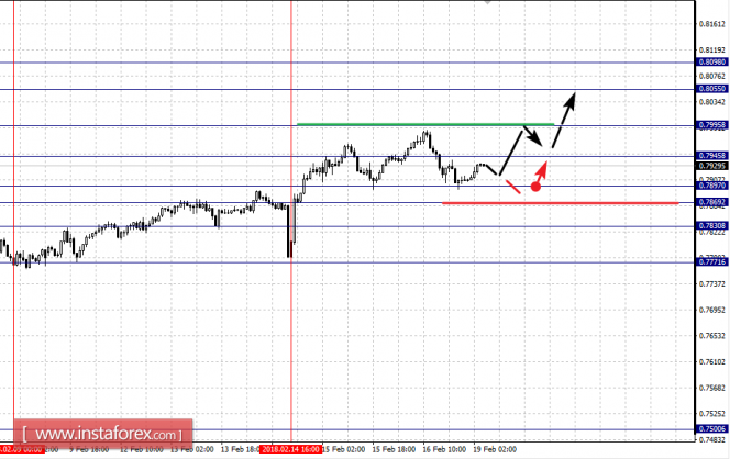 Краткосрочное нисходящее движение возможно в коридоре 0.7897 – 0.7869, пробой последнего значения приведет к углубленной коррекции, здесь цель – 0.7830, этот уровень является ключевой поддержкой для верха.