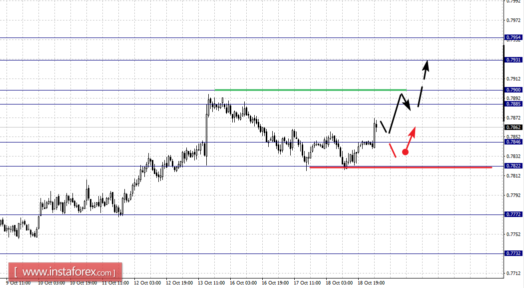 Краткосрочное нисходящее движение возможно в коридоре 0.7846 – 0.7822, пробой последнего значения приведет к развитию нисходящей тенденции в масштабе Н1, здесь потенциальная цель – 0.7772.