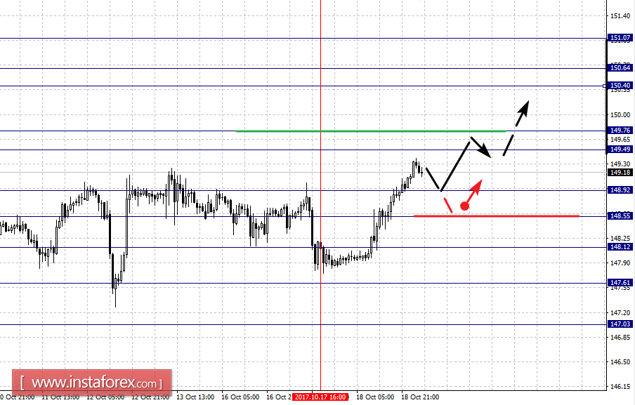Краткосрочное нисходящее движение возможно в коридоре 148.92 – 148.55, пробой последнего значения приведет к углубленной коррекции, здесь цель – 148.12, этот уровень является ключевой поддержкой для верха, его пробой приведет к отмене восходящей структуры от 17 октября и в данном случае первая цель – 147.61.