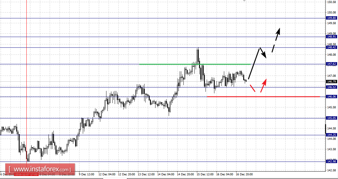 Краткосрочное нисходящее движение возможно в коридоре 146.52 – 146.06, пробой последнего значения приведет к углубленной коррекции, здесь цель 145.05, этот уровень является ключевой поддержкой для восходящего движения, его пробой ценой будет располагать к развитию нисходящей структуры, в данном случае потенциальная цель – 144.25.