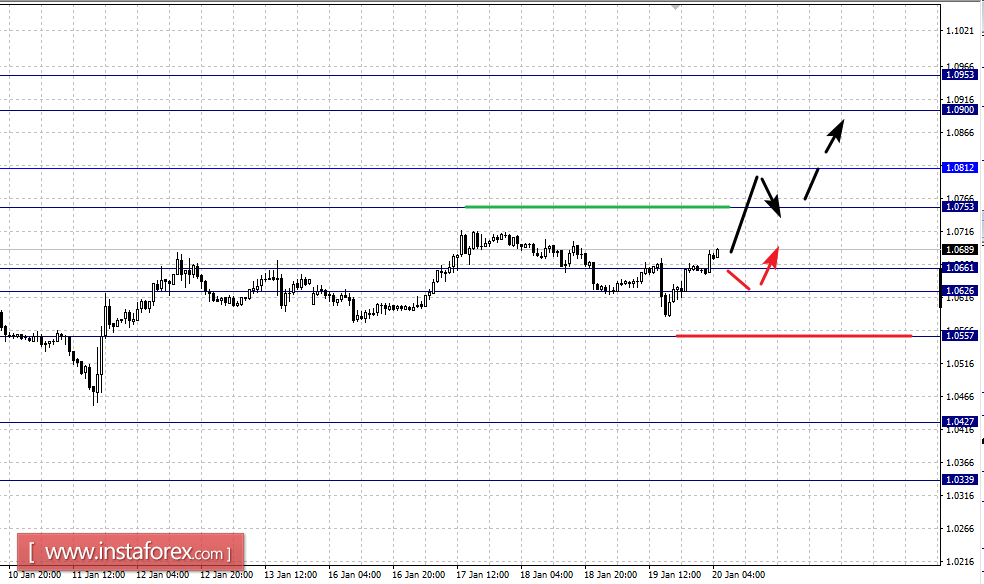 Краткосрочное нисходящее движение возможно в коридоре 1.0661 – 1.0626, пробой последнего значения приведет к развитию углубленной коррекции, здесь цель – 1.0557, этот уровень является ключевой поддержкой для верха.