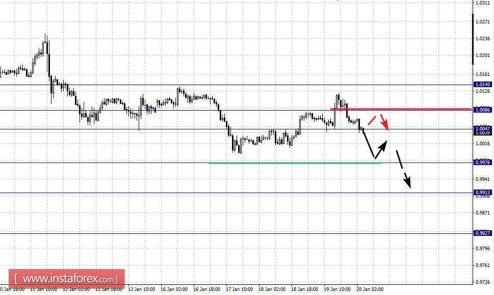 По паре Доллар/Франк ключевыми уровнями в масштабе Н1 являются: 1.0140, 1.0086, 1.0047, 0.9976, 0.9913 и 0.9827. Здесь мы продолжаем следить за развитием нисходящей структуры от 3 января, на текущий момент цена находится в коррекции. Продолжения движения книзу ожидаем после пробоя 0.9976, в данном случае цель – 0.9913, возле этого уровня консолидация цены. Потенциальным значением для низа считаем уровень 0.9827, от которого ожидаем откат кверху.