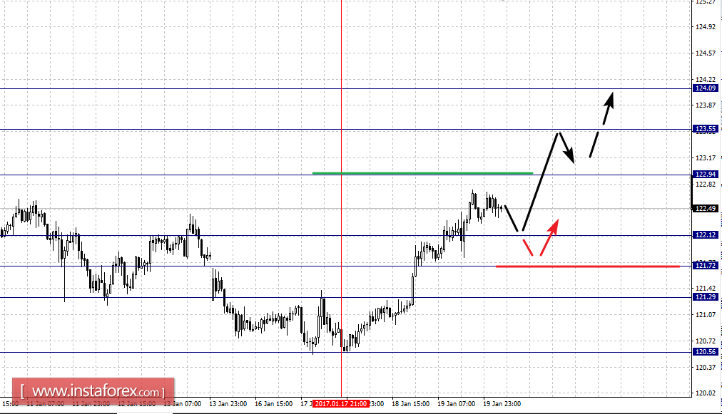 Краткосрочное нисходящее движение возможно в диапазоне 122.12 – 121.72, пробой последнего значения приведет к углубленному движению, здесь цель – 121.29, этот уровень является ключевой поддержкой для верха.