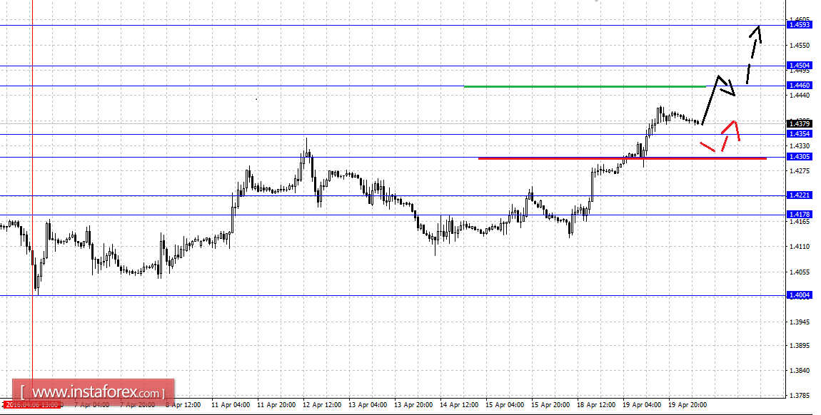 Краткосрочное нисходящее движение ожидаем в коридоре 1.4354 – 1.4305, пробой последнего значения приведет к углубленной коррекции, здесь цель – 1.4221, диапазон 1.4221 – 1.4178 шумовой, до него ожидаем оформление потенциала для нисходящего цикла.