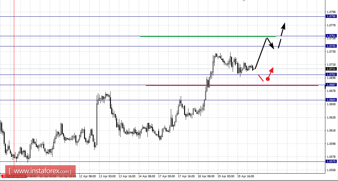 Краткосрочное нисходящее движение возможно в коридоре 1.0702 – 1.0687, пробой последнего значения приведет к углубленному движению, здесь цель – 1.0664, этот уровень является ключевой поддержкой для верха.
