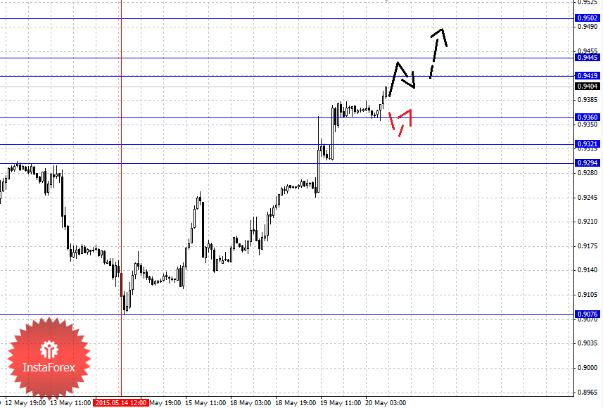 По паре Доллар/Франк ключевыми уровня в масштабе Н1 являются: 0.9502, 0.9445, 0.9419, 0.9360, 0.9321 и 0.9294. Здесь мы продолжаем следить за восходящей структурой от 14 мая. Краткосрочное восходящее движение возможно в коридоре 0.9419 – 0.9445, пробой последнего значения должен сопровождаться выраженным движением кверху, здесь цель – 0.9502, возле этого уровня консолидация цены. Краткосрочное нисходящее движение возможно после пробоя 0.9360, здесь цель – 0.9321, диапазон 0.9321 – 0.9294 является ключевой поддержкой для восходящего движения.