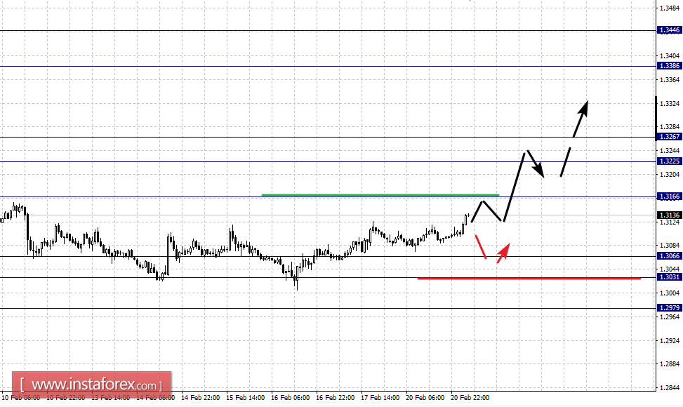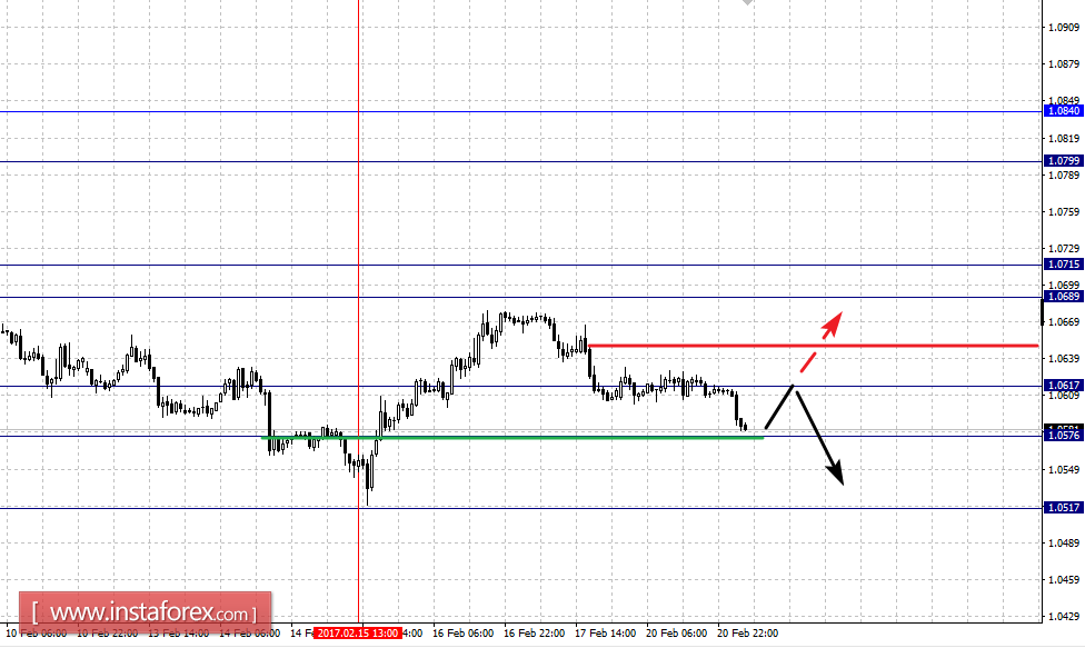 Консолидированное движение ожидаем в диапазоне 1.0617 – 1.0576, пробой последнего значения приведет к отмене восходящей структуры от 15 февраля, в данном случае первая потенциальная цель для низа – 1.0517.