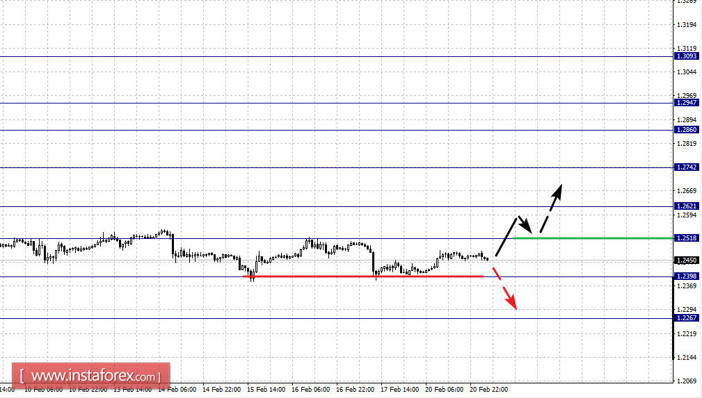 Краткосрочное нисходящее движение, а также консолидация, возможны в коридоре 1.2518 – 1.2398, пробой последнего значения приведет к развитию нисходящей структуры, в данном случае цель – 1.2267.