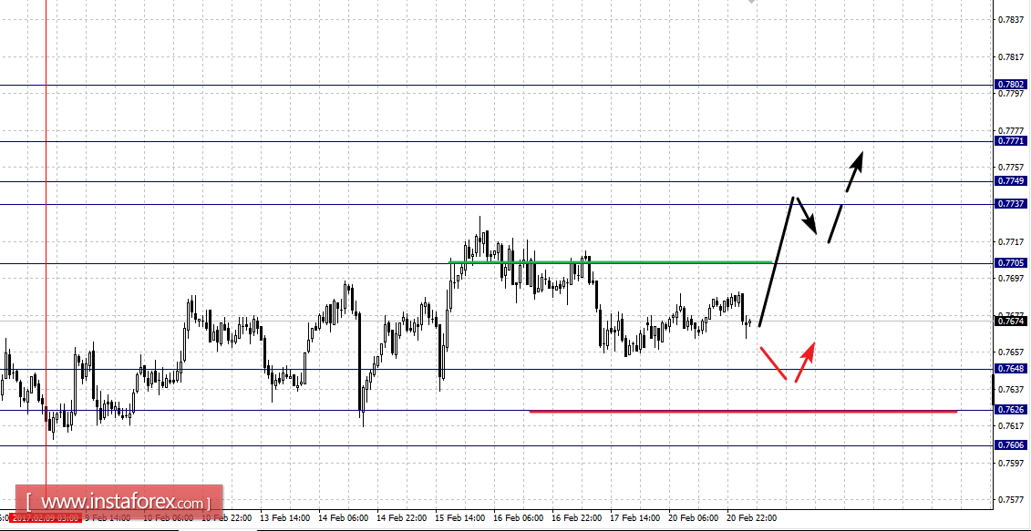 Краткосрочное нисходящее движение возможно в коридоре 0.7648 – 0.7626, пробой последнего значения приведет к отмене восходящей структуры, в данном случае первая цель – 0.7606.