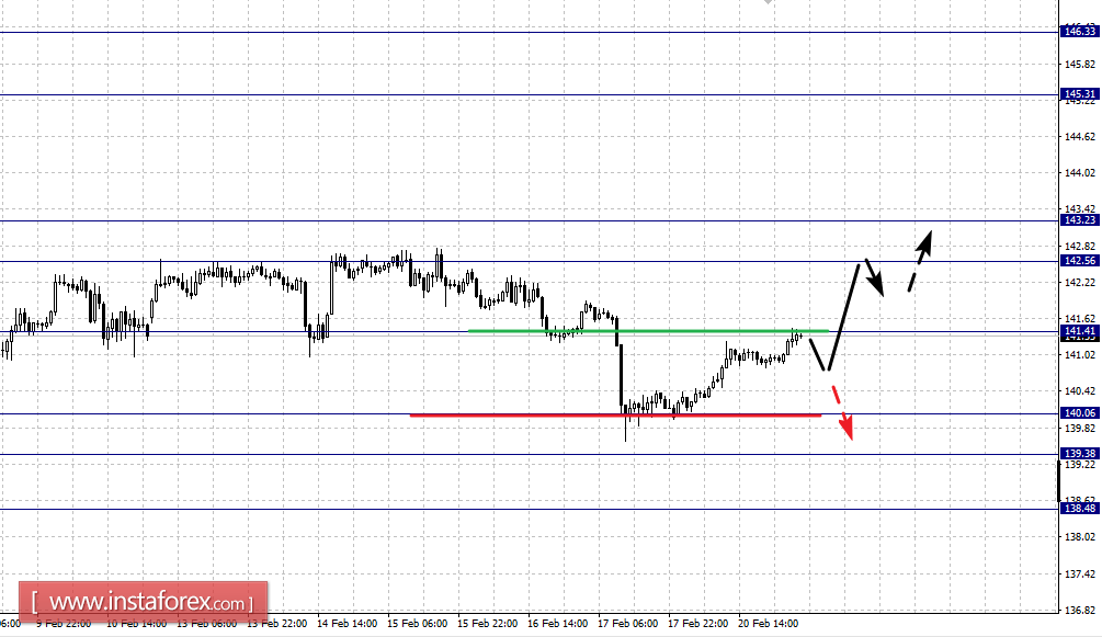 По паре Фунт/Иена ключевыми уровнями в масштабе Н1 являются: 146.33, 145.31, 143.23, 142.56, 141.41, 139.38 и 138.48. Здесь мы следим за среднесрочной восходящей структурой от 7 февраля, и на текущий момент цена близка к ее отмене, для чего необходим пробой диапазона 140.06 – 139.38, в данном случае первая цель – 138.48. Продолжения движения кверху ожидаем после пробоя 141.45, в данном случае цель – 142.56. Краткосрочное движение кверху ожидаем в коридоре 142.56 – 143.23, пробой последнего значения должен сопровождаться выраженным восходящим движением к уровню 145.31, возле которого ожидаем консолидацию. Потенциальным значением для верха считаем уровень 146.33, по достижении которого ожидаем откат в коррекцию.