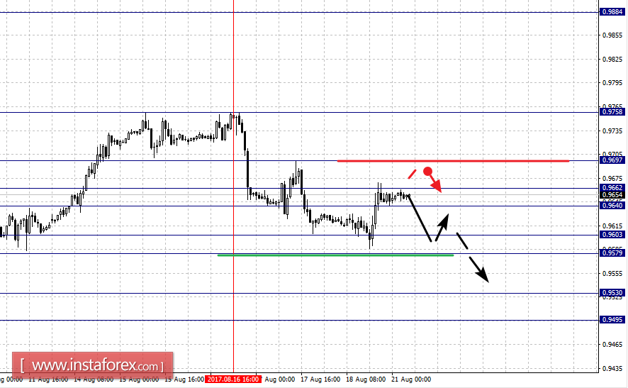 Краткосрочное восходящее движение возможно в коридоре 0.9640 – 0.9662, пробой последнего значения приведет к углубленному движению, здесь цель – 0.9697, этот уровень является ключевой поддержкой для нисходящей структуры от 16 августа.