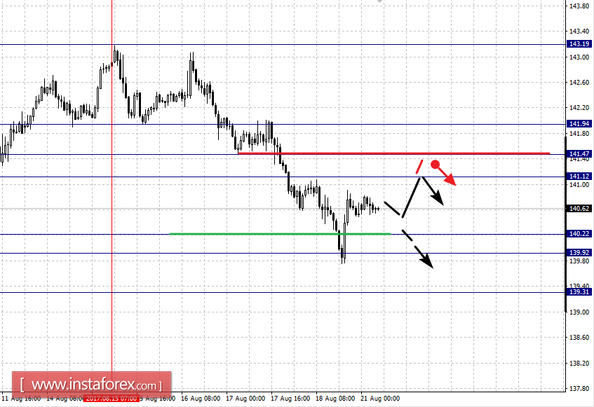 Краткосрочное восходящее движение возможно в коридоре 141.12 – 141.47, пробой последнего значения приведет к углубленной коррекции, здесь цель 141.94, этот уровень является ключевой поддержкой для нисходящей структуры от 15 августа, до него мы ожидаем оформления выраженных начальных условий для восходящего цикла.