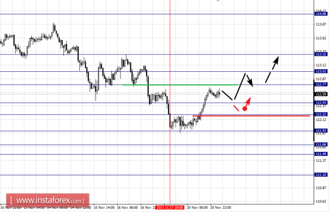 По паре Доллар/Иена ключевыми уровнями в масштабе являются: 113.32, 113.01, 112.77, 112.43, 112.22, 111.92, 111.66, 111.49 и 111.10. Здесь мы продолжаем следить за нисходящей структурой от 6 ноября, на текущий момент цена формирует потенциал для верха от 17 ноября. Краткосрочное восходящее движение возможно в коридоре 112.77 – 113.01, пробой последнего значения будет располагать к развитию восходящей тенденции, в данном случае потенциальная цель – 113.32, возле этого уровня консолидация.