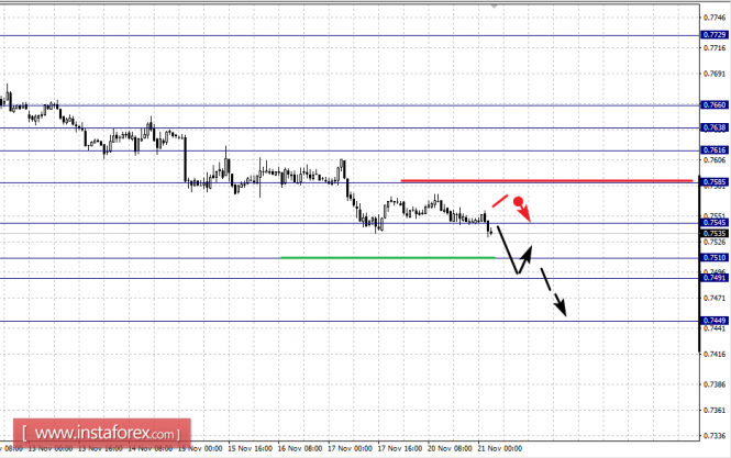 Уход в коррекцию возможен после пробоя 0.7585, в данном случае первая цель – 0.7616. Краткосрочное восходящее движение ожидаем в коридоре 0.7616 – 0.7638, пробой последнего значения приведет к движению, здесь цель – 0.7660, до которой мы ожидаем оформления начальных условий для восходящего цикла.