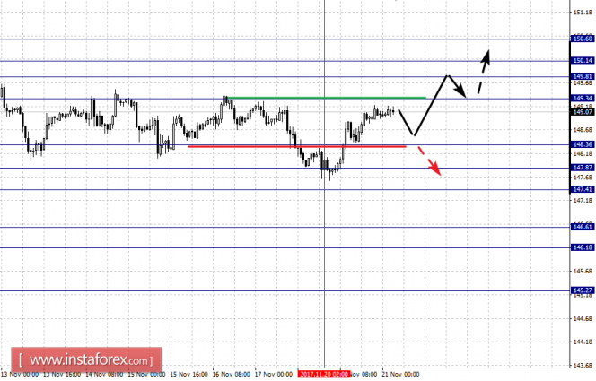 Пробой уровня 149.34 будет располагать к развитию восходящей структуры от 20 ноября, в данном случае цель – 149.81, в коридоре 149.81 – 150.14 консолидация цены. Потенциальным значением для верха считаем уровень 150.60.