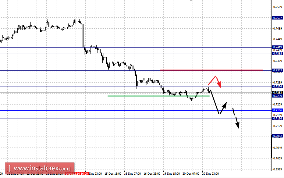 По паре Австралийский доллар/Доллар ключевыми уровнями в масштабе Н1 являются: 0.7419, 0.7395, 0.7333, 0.7274, 0.7239, 0.7186, 0.7156 и 0.7092. Здесь мы следим за развитием нисходящей структуры от 14 декабря. Консолидированное нисходящее движение, возможно в коридоре 0.7274 – 0.7239, пробой последнего значения должен сопровождаться выраженным движением к уровню 0.7186, по достижении которого ожидаем консолидацию в коридоре 0.7186 – 0.7156. Потенциальным значением для низа считаем уровень 0.7092, движение к которому ожидаем после пробоя 0.7155.