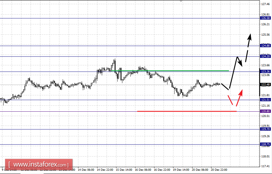 Краткосрочное нисходящее движение возможно в коридоре 121.51 – 120.80, пробой последнего значения будет располагать к развитию нисходящей тенденции, в данном случае первая цель – 119.70.