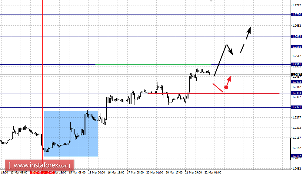 Краткосрочное нисходящее движение возможно в коридоре 1.2433 – 1.2384, пробой последнего значения приведет к углубленному движению, здесь цель – 1.2321, этот уровень является ключевой поддержкой для верха.