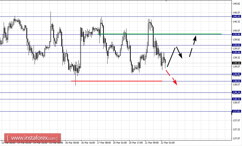 Краткосрочное восходящее движение возможно в коридоре 139.46 – 139.65, пробой последнего значения приведет к углубленному движению, здесь цель – 139.96, этот уровень является ключевой поддержкой для нисходящей структуры от 17 марта.