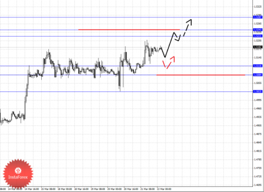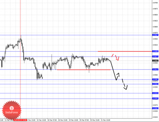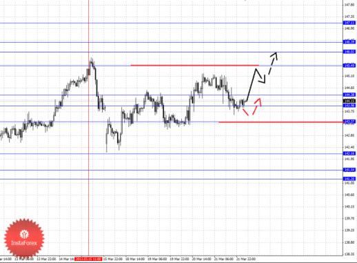 По паре Евро/Доллар развитие восходящей структуры от 19 марта ожидаем после пробоя 1.2998. По паре Доллар/Франк продолжаем следить за нисходящей структурой от 14 марта, однако на текущий момент цена близка к ее отмене. По паре Фунт/Доллар следим за восходящим циклом от 12 марта. По паре Доллар/Иена движение книзу ожидаем после пробоя 94.65. По паре Евро/Иена развитие восходящей структуры мы ожидаем после пробоя 123.52, ее отмены после пробоя 121.81. По паре Фунт/Иена ключевые цели остались без изменения.