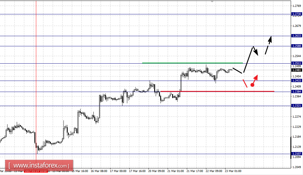 Краткосрочное нисходящее движение возможно в коридоре 1.2433 – 1.2384, пробой последнего значения приведет к углубленному движению, здесь цель – 1.2321, этот уровень является ключевой поддержкой для верха.