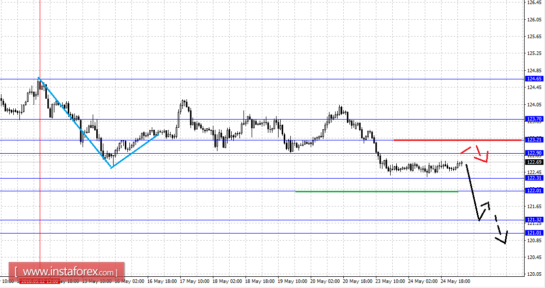 Краткосрочное нисходящее движение возможно в коридоре 109.31 – 108.75, отсюда ожидаем ключевой разворот кверху, пробой уровня 108.75 начнет развитие нисходящего движения в масштабе Н1 от 20 мая.
