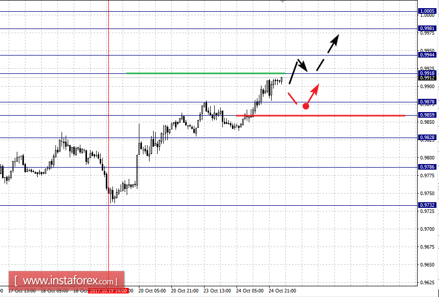 Краткосрочное нисходящее движение возможно в коридоре 0.9878 – 0.9859, пробой последнего значения приведет к углубленной коррекции, здесь цель – 0.9828, этот уровень является ключевой поддержкой для верха, его пробой будет располагать к развитию нисходящего движения, в данном случае цель – 0.9786.