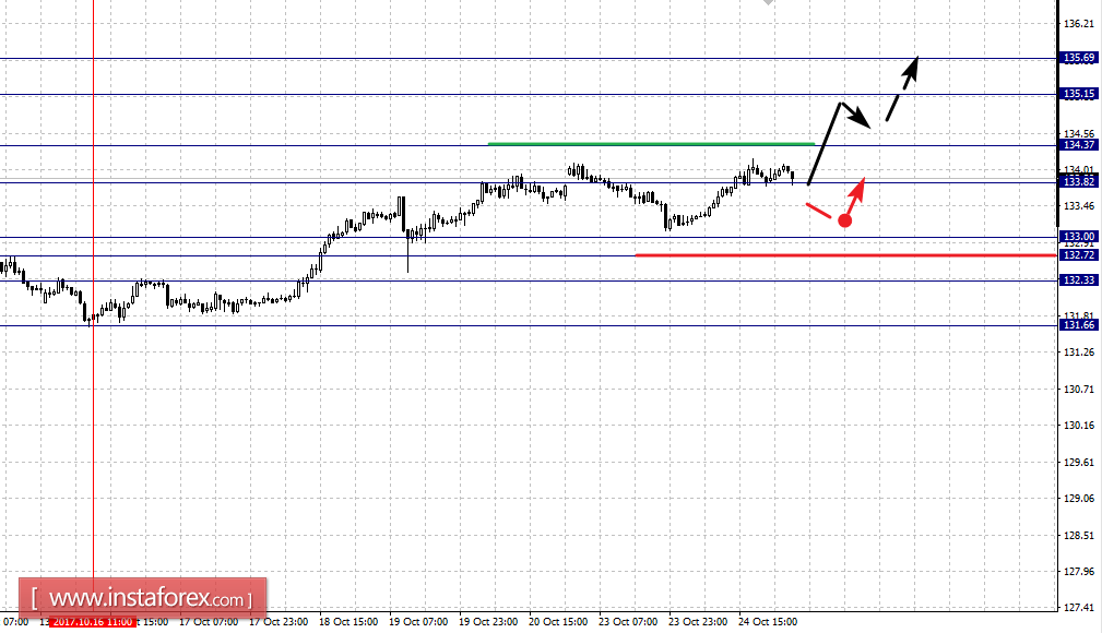 Краткосрочное нисходящее движение возможно в коридоре 133.00 – 132.72, пробой последнего значения приведет к углубленному движению, здесь цель – 132.33, этот уровень является ключевой поддержкой для низа.