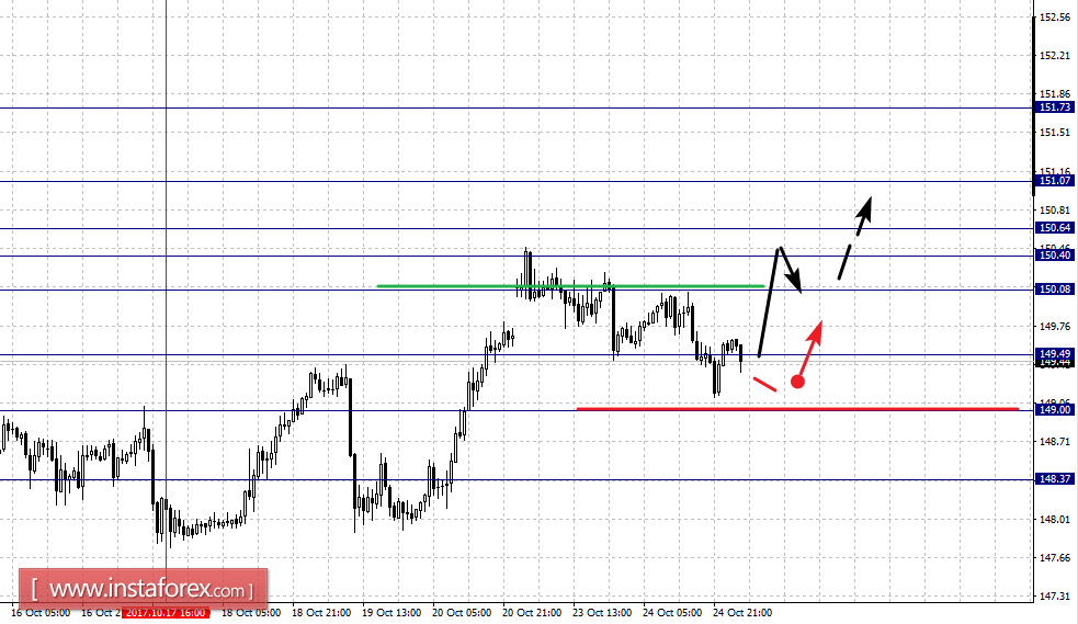 По паре Фунт/Иена ключевыми уровнями в масштабе Н1 являются: 151.73, 151.07, 150.64, 150.40, 149.79, 149.49 и 149.00. Здесь мы продолжаем следить за восходящей структурой от 17 октября, на текущий момент цена находится в зоне коррекции. Продолжения движения кверху ожидаем после пробоя уровня 150.08, в данном случае первая цель – 150.40, в коридоре 150.40 – 150.64 консолидация. Пробой уровня 150.66 позволит рассчитывать на выраженное движение, здесь цель – 151.07, возле этого уровня консолидация. Потенциальным значением для верха считаем уровень 151.73, от которого ожидаем откат.