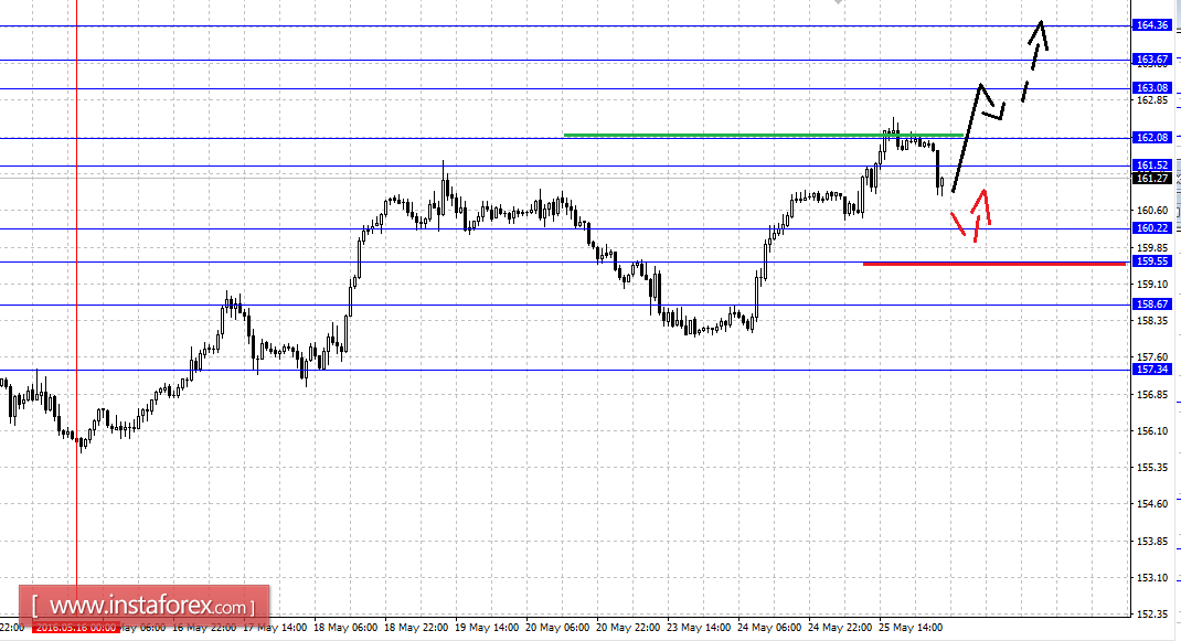 Краткосрочное нисходящее движение возможно в коридоре 160.22 – 159.55, пробой последнего значения приведет к углубленной коррекции, здесь цель – 158.67, этот уровень является ключевой поддержкой для верха, его проход ценой будет располагать к развитию нисходящей структуры, в данном случае потенциальная цель 157.34.