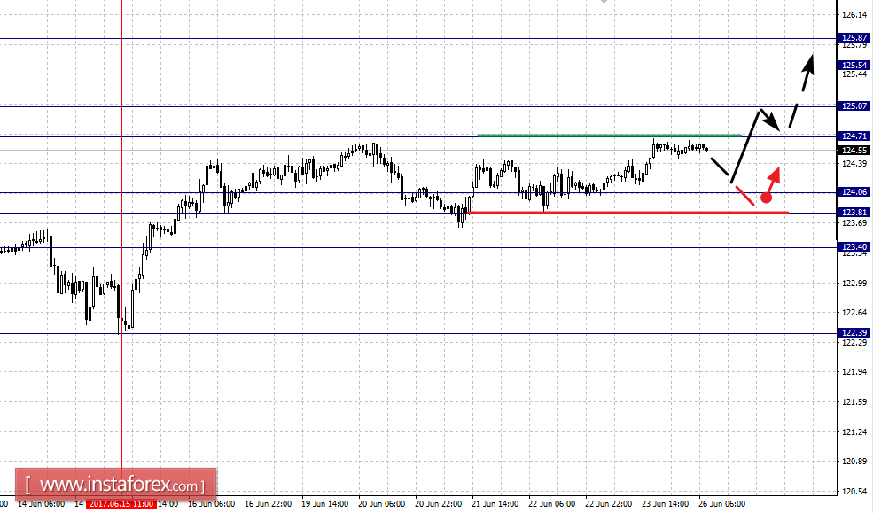Краткосрочное нисходящее движение возможно в коридоре 124.06 – 123.81, пробой последнего значения приведет к углубленной коррекции, здесь цель – 123.40, этот уровень является ключевой поддержкой для верха.
