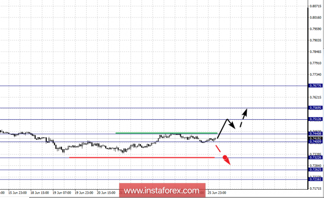 По паре Австралийский доллар/Доллар ключевыми уровнями в масштабе Н1 являются: 0.7569, 0.7512, 0.7440, 0.7400, 0.7322, 0.7262 и 0.7216. Здесь мы продолжаем следить за нисходящим циклом от 6 июня. Продолжения движения книзу ожидаем после пробоя уровня 0.7322, здесь цель – 0.7262, в коридоре 0.7262 – 0.7216 консолидация и отсюда ожидаем ключевой разворот кверху.