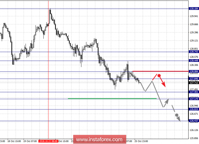 Краткосрочное восходящее движение возможно в коридоре 127.84 – 128.08, пробой последнего значения приведет к затяжной коррекции, здесь цель – 128.44, этот уровень является ключевой поддержкой для нисходящей структуры от 22 октября, его пробой будет располагать к формированию восходящей структуры, в данном случае цель – 128.74