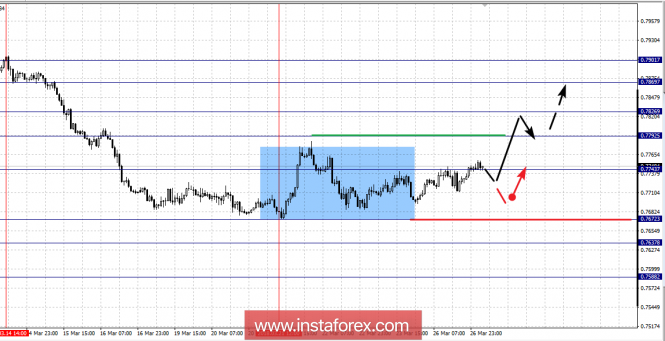 Отмены восходящей структуры от 21 марта ожидаем после пробоя 0.7672, в данном случае первая цель – 0.7637. Потенциальным значением для низа считаем уровень 0.7588, по достижении которого ожидаем откат кверху.