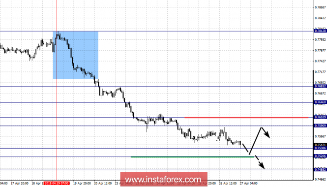 Краткосрочное восходящее движение возможно в коридоре 0.7590 – 0.7610, пробой последнего значения приведет к углубленной коррекции, здесь цель – 0.7646, этот уровень является ключевой поддержкой для нисходящего цикла. До уровня 0.7683 мы ожидаем оформления начальных условий для восходящего движения.