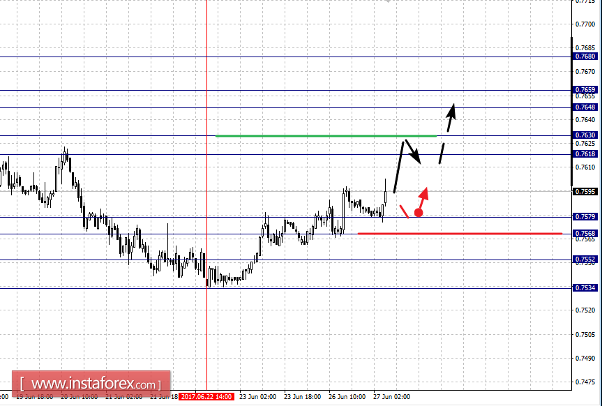 Краткосрочное нисходящее движение возможно в коридоре 0.7579 – 0.7568, пробой последнего значения приведет к углубленной коррекции, здесь цель – 0.7552, этот уровень является ключевой поддержкой для низа.