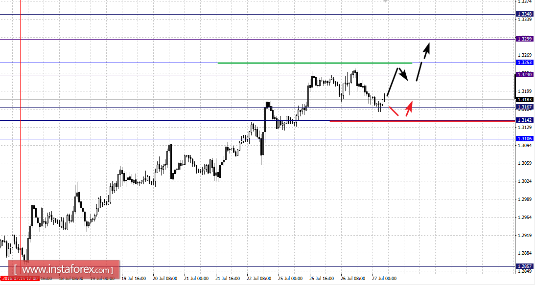 Краткосрочное нисходящее движение возможно в коридоре 1.3167 – 1.3142, пробой последнего значения приведет к углубленной коррекции, здесь цель – 1.3106, этот уровень является ключевой поддержкой для верха.