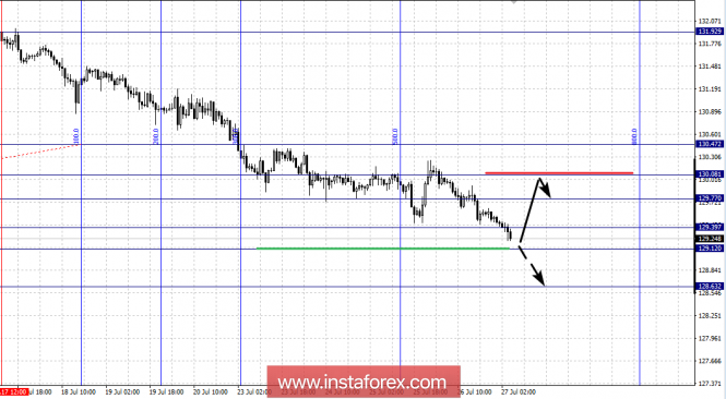 По паре Евро/Иена ключевыми уровнями в масштабе Н1 являются: 130.47, 130.08, 129.77, 129.39, 129.12 и 128.63. Здесь мы следим за развитием нисходящего движения от 17 июля. Консолидированное движение ожидаем в диапазоне 129.39 – 129.12, пробой последнего значения позволит рассчитывать на движение к потенциальной цели – 128.63, от этого уровня ожидаем откат кверху и развитие восходящей структуры.